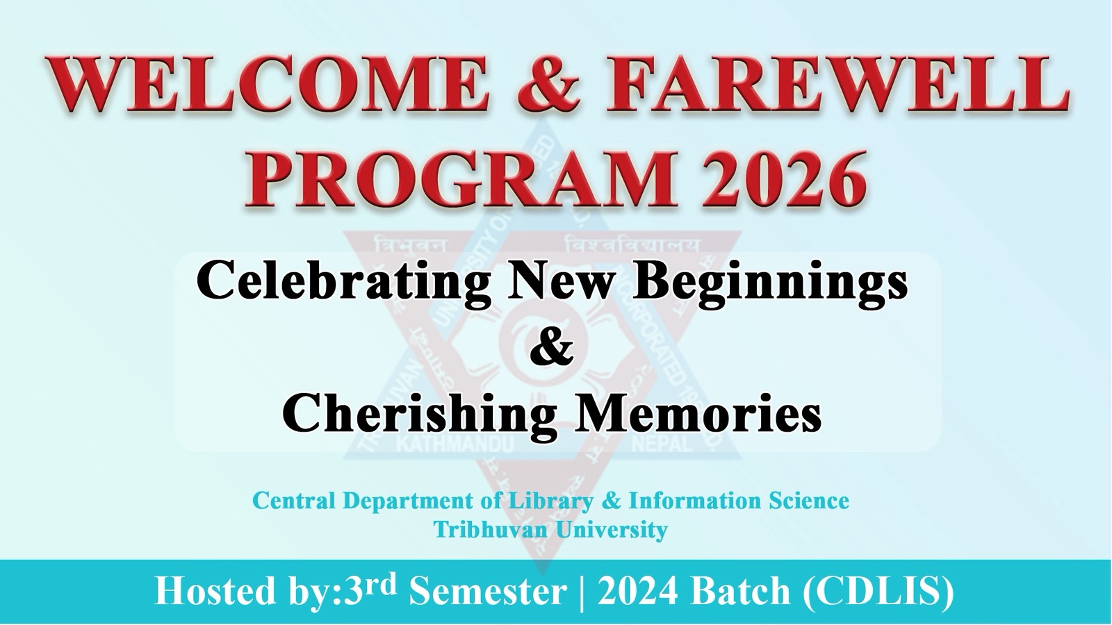 2082/12/08 गते पुस्तकालय तथा सूचना विज्ञान केन्द्रीय विभागमा स्नातकोत्तर तेस्रो सेमेस्टरमा अध्ययनरत विद्यार्थीहरूद्वारा आयोजित स्वागत तथा बिदाइ कार्यक्रम धुमधामका साथ सम्पन्न भएको छ। केन्द्रीय विभागस्थित गान्धी भवनमा आयोजित उक्त कार्यक्रममा नवप्रवेशी विद्यार्थीहरूलाई स्वागत तथा दीक्षित हुन लागेका चौथो सेमेस्टरका विद्यार्थीहरूलाई बिदाइ गर्दै मायाको चिनो प्रदान गरिएको थियो।विभागीय प्रमुख डा. लिला न्याइच्याईको प्रमुख आतिथ्यमा सम्पन्न कार्यक्रममा विभागका प्राध्यापकहरू र नेपाल पुस्तकालय संघका अध्यक्षलगायतको उपस्थिति रहेको थियो। कार्यक्रममा विद्यार्थीहरूले सांस्कृतिक, सिर्जनात्मक र साहित्यिक प्रस्तुतिहरू गरेका थिए।तेस्रो सेमेस्टरमा अध्ययनरत विद्यार्थी मनिषा राईले स्वागत मन्तव्यका क्रममा नवप्रवेशीलाई स्वागत तथा दीक्षित हुन लागेकालाई शुभकामना व्यक्त गर्दै यस्ता समारोह औपचारिकता मात्र नभई सधैँ बाँचिरहने जीवनका अमूल्य क्षणहरू हुने कुरा राखेकी थिइन् ।प्रथम सेमेस्टरमा अध्ययनरत विद्यार्थीहरूले आफ्ना अनुभूति र अपेक्षाहरू व्यक्त गरेका थिए भने चौथो सेमेस्टरमा अध्ययनरत विद्यार्थीहरूले शैक्षिक यात्राका क्रममा प्राप्त अनुभव र सिकाइहरू सुनाएका थिए। सर्जक तथा त्रिभुवन विश्वविद्यालय केन्द्रीय पुस्तकालयका पुस्तकालय अधिकृत अनिता भट्टराईले शिक्षामा आध्यात्मिकताको महत्वबारे चर्चा गर्दै शैक्षिक उन्नयनमा यसको भूमिकालाई रेखांकित गर्नुभएको थियो । नेपाल पुस्तकालय सङ्घका अध्यक्ष पुष्पराज सुवेदीले पुस्तकालय संगठन र भावी कार्यदिशाको विषयमा आफ्ना धारणा राख्नु भएको थियो।प्राध्यापकद्वय सरिता गौतम र निरा मानन्धरले विद्यार्थीहरूलाई प्रेरणा र हौसला प्रदान गर्दै शैक्षिक जीवनमा लगनशीलता र सिर्जनशीलताको आवश्यकताबारे मन्तव्य व्यक्त गर्नु भएको थियो ।कार्यक्रमका प्रमुख अतिथि तथा विभागीय प्रमुख डा. लिला न्याइच्याईले विश्व व्यवस्थामा आएको उतारचढावले पुस्तकालय विज्ञानको भविष्यलाई प्रत्यक्ष प्रभावित पार्ने भएकाले परिवर्तित सन्दर्भमा नयाँ कार्यदिशा र रणनीतिका साथ पुस्तकालय विज्ञानको भविष्य निर्माण गर्नुपर्ने आवश्यकतामा जोड दिनुपर्छ भन्ने कुरा बताउनु भयो । साथै उहाँले विद्यार्थीहरूलाई अनुशासन, मेहनत र निरन्तर सिकाइको महत्वबारे समेत मार्गदर्शन प्रदान गर्नु भयो।कार्यक्रमको सञ्चालन स्नातकोत्तर तेस्रो सेमेस्टरका विद्यार्थी सकुन्तला ढुङ्गाना र अध्यक्षता सोही सेमेस्टरका विद्यार्थी सुष्मा कोइरालाले गरेका थिए।