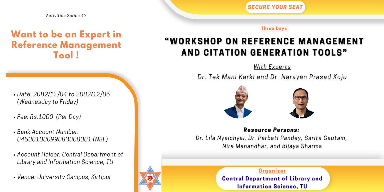 त्रिभुवन विश्वविद्यालय, पुस्तकालय तथा सूचना विज्ञान केन्द्रीय विभागमा सन्दर्भ व्यवस्थापन (Reference Management Tool) तथा वेब साइटेशन (Web Citation Generation Tools) सम्बन्धि तीन दिने कार्यशाला सफलतापूर्वक सम्पन्न भएको छ। यो कार्यशाला २०८२ चैत्र ४ गतेदेखि चैत्र ६ गतेसम्म केन्द्रीय पुस्तकालय तथा सूचना विज्ञान विभागमा आयोजना गरिएको थियो। कार्यशालामा विद्यावारिधि (Ph.D.), एमफिल (Mphil.), र स्नातकोत्तर (Masters) तहका शोधार्थीहरूको सहभागिता रहेको थियो। यस तालिम कार्यक्रममा शिक्षा (Education), जन प्रशासन (Public Administration), अन्तर्राष्ट्रिय सम्बन्ध तथा कूटनीति (International Relations and Diplomacy), रसायनशास्त्र (Chemistry), नेपाली (Nepali), र पुस्तकालय तथा सूचना विज्ञान (Library and Information Science) जस्ता विभिन्न विषयका शोधार्थीहरूको उपस्थिति थियो । कार्यशालाका क्रममा उप-प्राध्यापक डा. टेक मणी कार्कीले सफ्टवेयर installation तथा विभिन्न प्रकारका सूचना स्रोतहरूको सन्दर्भ (citation) लेख्ने आधारभूत नियमहरू बारे सहजीकरण गर्नुभएको थियो। सहभागीहरूलाई एन्ड्नोट सफ्टवेयर (Endnote software) मा डाटा भर्ने, इम्पोर्ट गर्ने, समूह (group) बनाउने, र सन्दर्भ तथा स्रोतको ढाँचा (editing citation and references output styles) सम्पादन गर्ने लगायतका प्राविधिक अभ्यासहरूको लागि उप-प्राध्यापक डा. नारायण कोजुले सहजीकरण गर्नुभएको थियो । यस कार्यशालामा उप-प्राध्यापक डा. लीला न्याइच्याई, उप-प्राध्यापक सरिता गौतम, उप-प्राध्यापक नीरा मानन्धर र पुस्तकालय अधिकृत विजय शर्माले पनि सहजीकरण गर्नुभएको थियो। उप-प्राध्यापक डा. पार्वती पाण्डेले सन्दर्भ निर्माणका लागि विभिन्न वेब प्रणाली (web tools) को प्रयोगबारे निर्देशन दिनुभएको थियो। तालिमको समापनमा डा. टेक मणी कार्कीले सहभागीहरूलाई प्रमाणपत्र वितरण गर्नुभएको थियो । सहभागी शोधार्थीहरू प्रकाश घिमिरे र दामोदर घिमिरेले यस उपयोगी कार्यक्रमको लागि सराहना गर्दै यस्ता व्यावहारिक कार्यक्रमहरूको सूचना प्रसारका लागि सञ्जाल विस्तार गर्न सुझाव दिनुभएको थियो। उहाँहरूले यस्ता उपयोगी कार्यक्रमका लागि कोषको अभाव नरहेको धारणा व्यक्त गर्नुभयो । तालिमको अन्त्यमा प्रमाणपत्र वितरण डा. टेक मणी कार्कीबाट भएको थियो। शोधार्थीहरू प्रकाश घिमिरे र दामोदर घिमिरेले कार्यक्रमको प्रशंसा गर्दै सूचना प्रसारको सञ्जाल विस्तार गर्न सुझाव दिनुभयो।