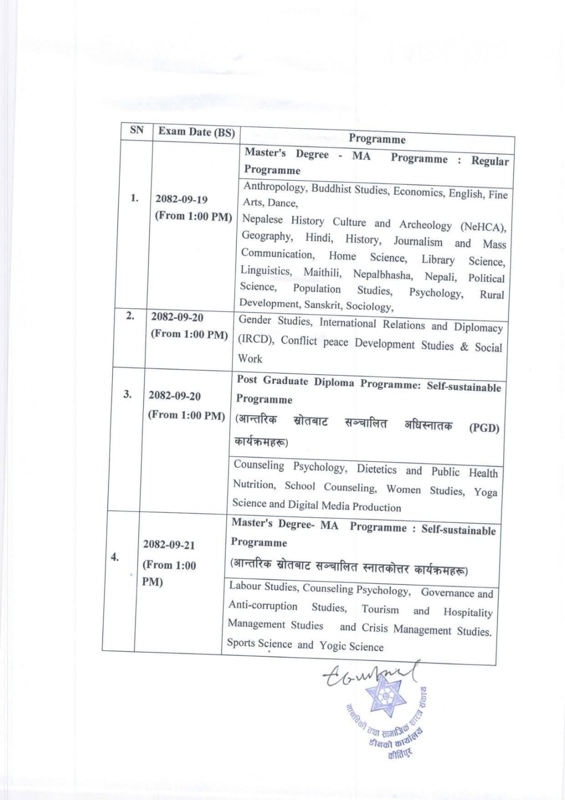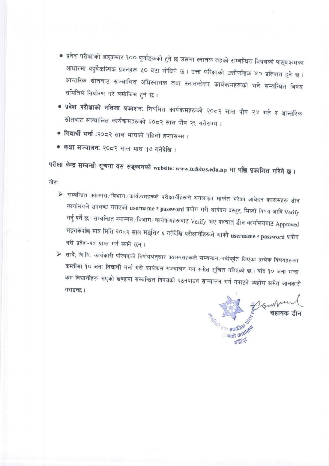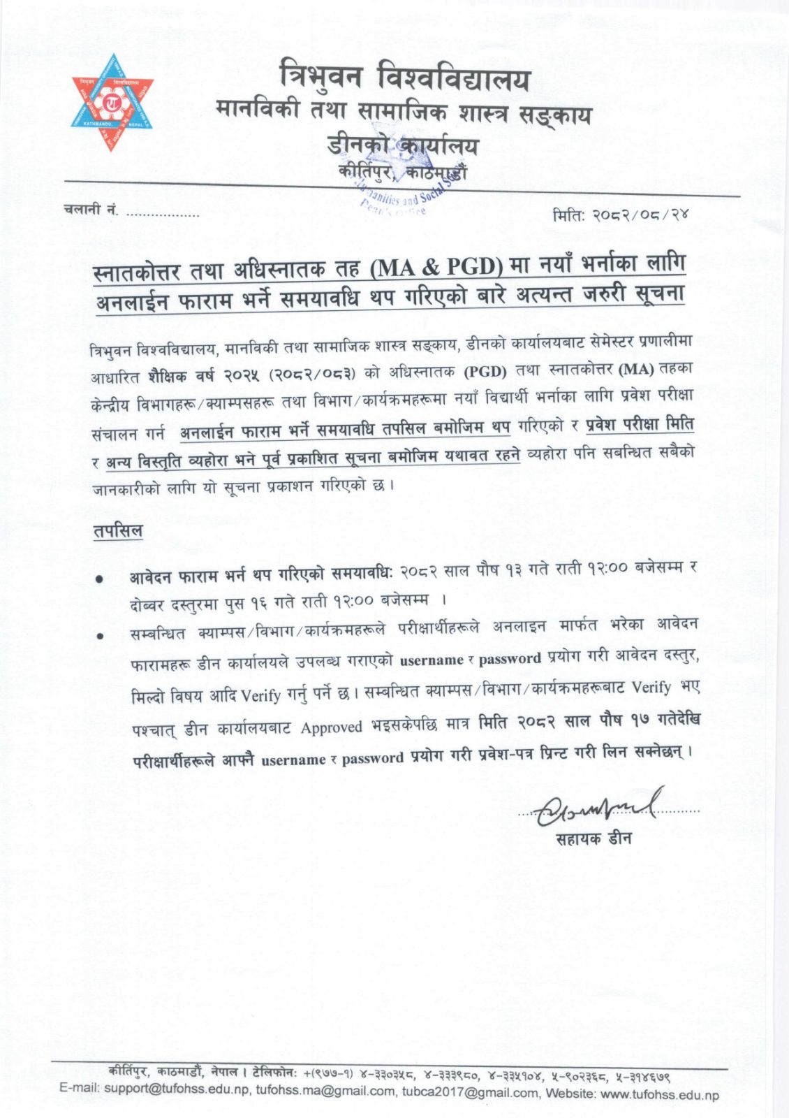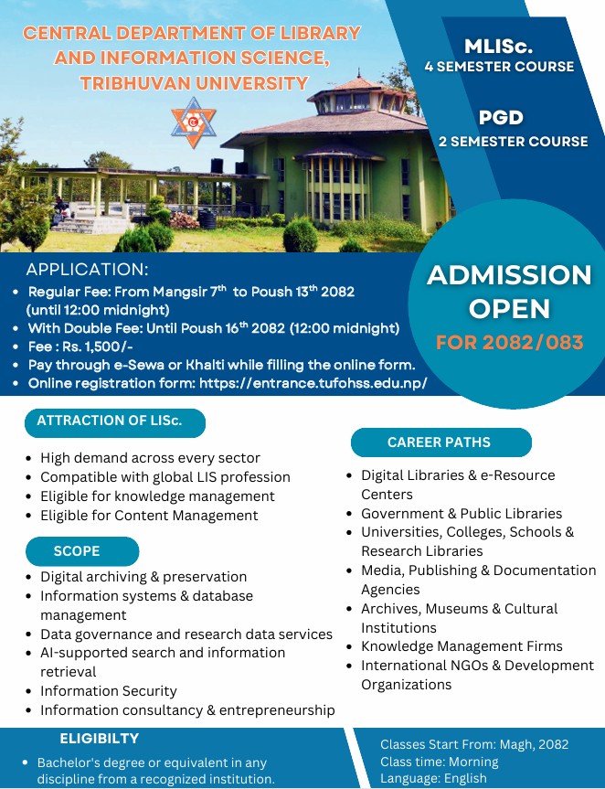 त्रिभुवन विश्वविद्यालय, मानविकी तथा सामाजिक शास्त्र सङ्कायअन्तर्गत पुस्तकालय तथा सूचना विज्ञान विषयमा सेमेस्टर प्रणालीमा आधारित शैक्षिक वर्ष २०८२/०८३ को अधिस्नातक (PGD) तथा स्नातकोत्तर (MA) तहका कार्यक्रमहरूमा नयाँ भर्नाका लागि अनलाईन फाराम भर्ने समयावधि थप गरिएको सूचना। अनलाइन फाराम भर्नको लागि Browser मा entrance.tufohss.edu.np टाइप गरी New Student Registration बाट पुस्तकालय तथा सूचना विज्ञान विषय तथा पुस्तकालय तथा सूचना विज्ञान केन्द्रीय विभाग छनोट गरी अनलाइन आवेदन फाराम भर्न सकिने छ।
